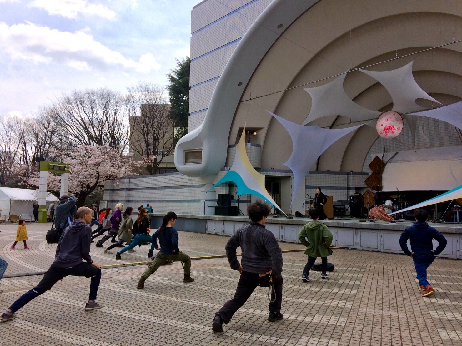 写真は昨年のもので、日曜の朝にステージで朝ヨガを担当させていただいたときの様子です。